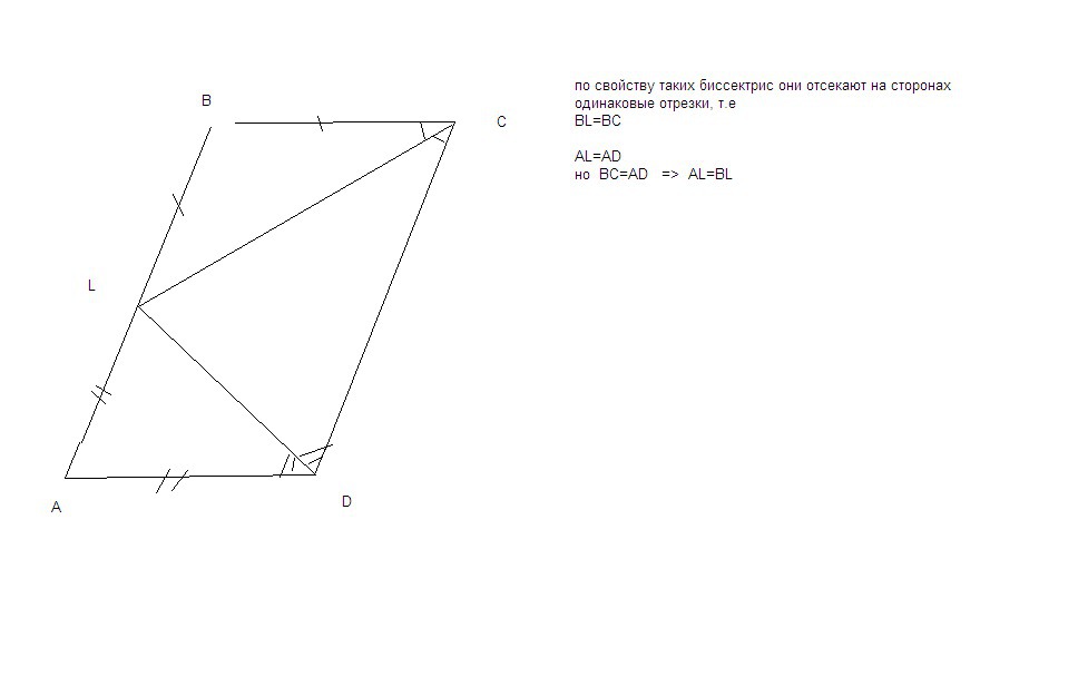 3) Т. к. ABCD - параллелограмм, то BC=AD. Т. к. BC=BL, AD=AL => BL=AL.