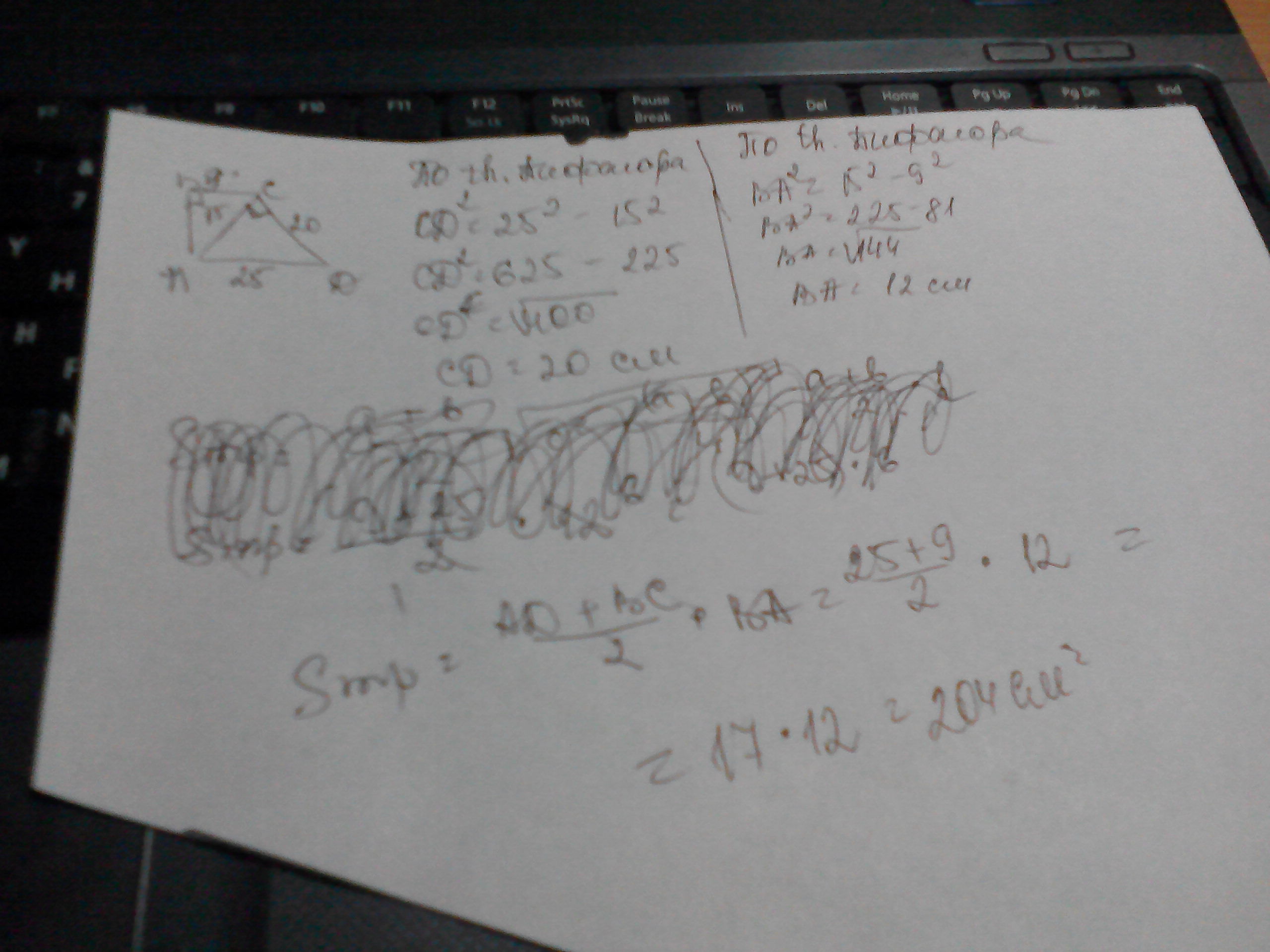 Геометрия в прямоугольной трапеция ABCD диагональ АС перпендикулярна стороне СD. ВС=9, АС=15, AD=25. Найдите площадь трапеции.