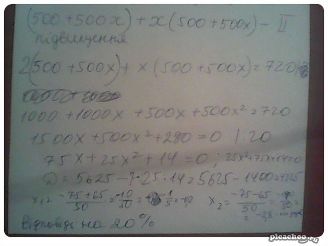 Після двох послідовних підвищень ціни на одну й ту саму кількість % ціна стільця зросла з 500 до 720 .На скільки % кожного разу підвищувалась ціна?