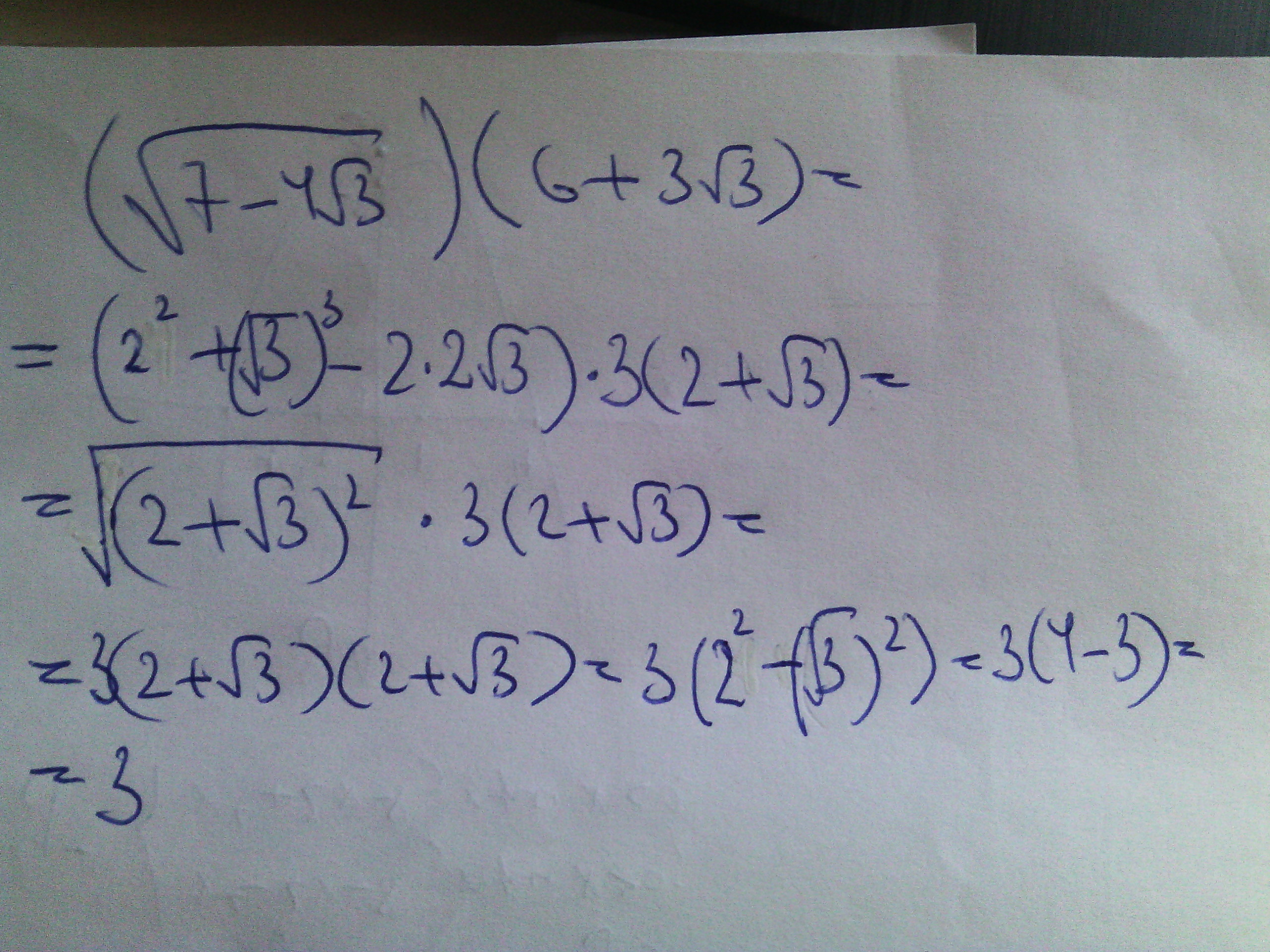 Аа, ошибочка вышла, там в третьей строчке в первой скобке под корнем минус, а не плюс. Потом получаем две почти одинаковые скобки, только с разными знаками и складываем выражение по формуле сокращенного умножения (разность квадратов). Там в третьей строчке после второго знака написано 2^2-(√3)^2, это получилось из (2+√3)(2-√3). Но результат тот же, вам нужно только два плюса на два минуса исправить)