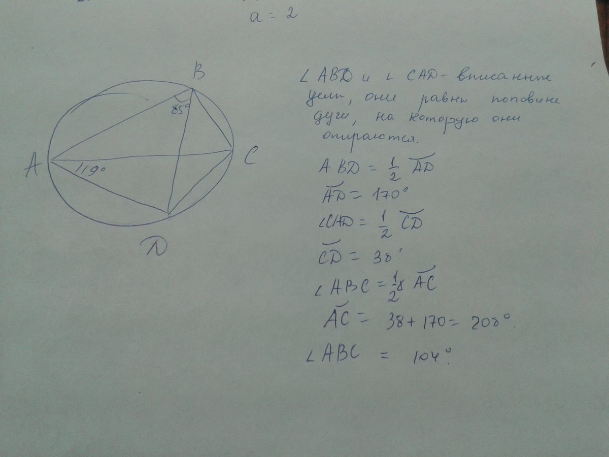Четырёхугольник АВСД вписан в окружности. Угол АВД равен 85, а угол САД 19. Найти угол АВС. Срочно! !!!