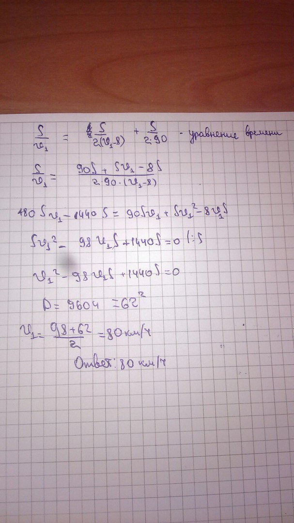 Из А в B одновременно выехали два автомобилиста. Первый проехал с постоянной скоростью весь путь. Второй проехал первую половину пути со скоростью, меньшей скорости первого автомобилиста на 8 км/ч, а вторую половину пути проехал со скоростью 90 км/ч, в результате чего прибыл в B одновременно с первым автомобилистом. Найдите скорость первого автомобилиста, если известно, что она больше 75 км/ч.