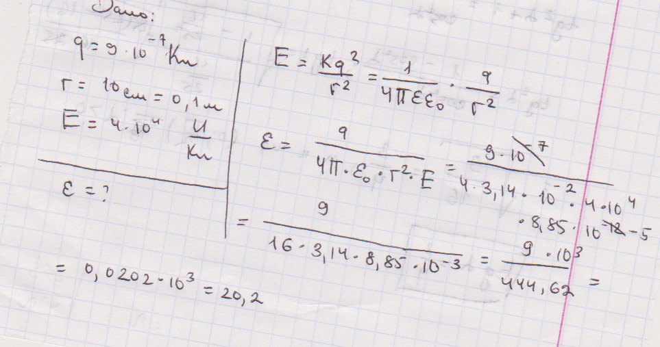 e=kq/E*r^2=9*10-7*9*10^9/4*10^4*100*10^-4=8100/400=20.25