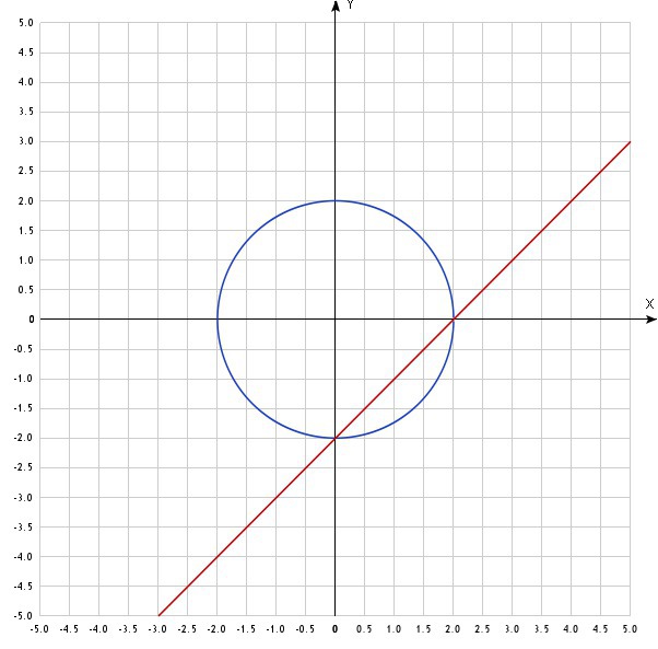 График первого уравнения окружность, а второго - прямая, пересекающая эту окружность в точках с координатами (0;-2) и (2;0).