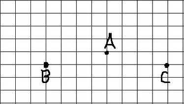 опускаем от точки А на отрезок ВС перпендикуляр на середину отрезка. Получается отрезок , длиной одна клетка. Весь отрезок ВС равен 8 клеток, середина - 4 клетки. Ответ: Расстояние от точки А до середины отрезка ВС - 1 клетка