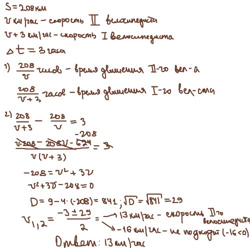 два велосипедиста одновременно отправились в 208-километровый пробег. первый едет со скоростью на 3км/ч больше, чем второй, и прибывает к финишу на 3 часа раньше второго. найдите скорость второго велосипедиста