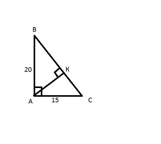в прямоугольном треугольнике один из катетов равен 15 см а второй 20 см найдите высоту спущенную из вершины прямого угла на гипотенузу