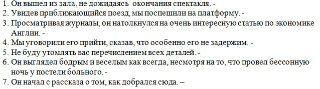 1. It came out of the room, not the end of the play rain. 2.Uvidev train coming, we rushed to the platform. 3.Prosmatrivaya magazine, he came across a very interesting article on the British economy. 4. We ygovorili the plug to come, saying that he was not particularly zaderzhim.5.Ne'll bore you with listing all detaley.6.On looked bright and cheerful as the vcerda, despite the fact that he had spent a sleepless night in bed bolnogo.7.On He began with a story about how I got here.