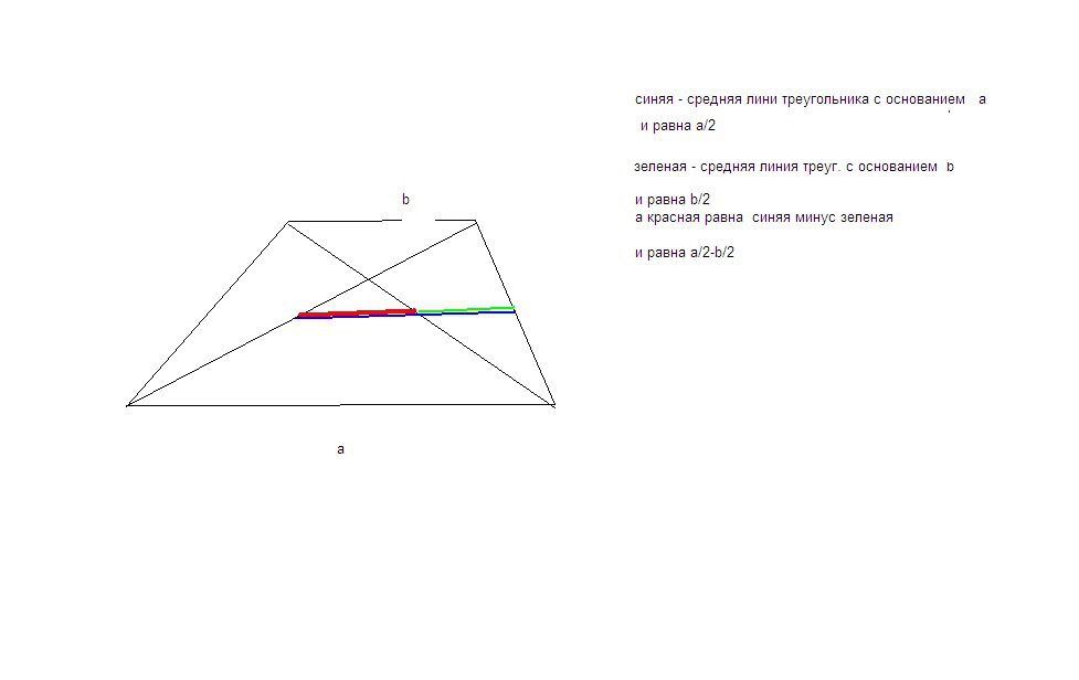 Довести, що відрізок, який сполучає середини діагоналей трапеції, паралельний основам і дорівнює їхній піврізниці (різниці довжин на 2)