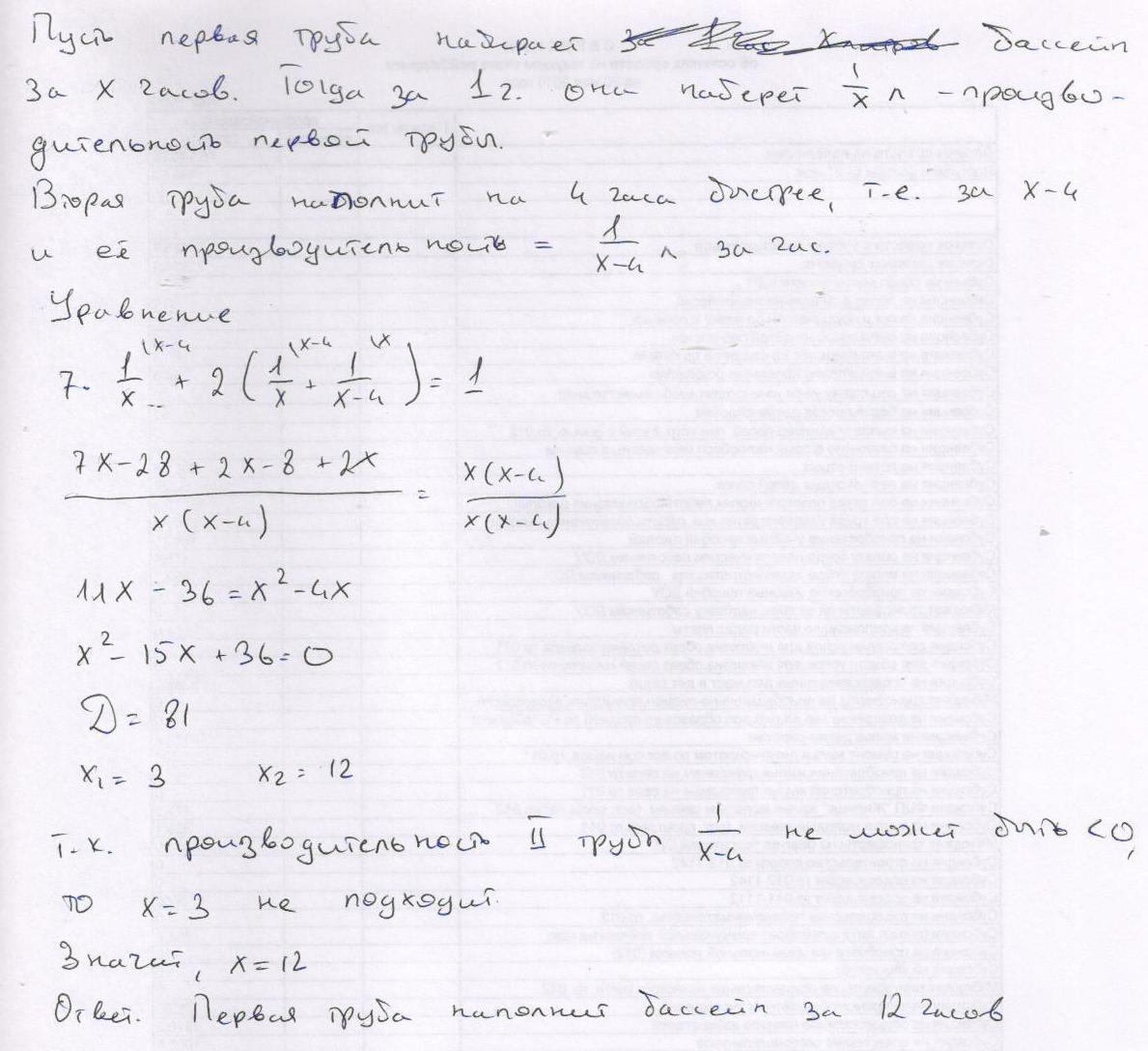 помогите пожалуйста решить задачу Бассейн можно наполнить водой через две трубы . На протяжении 7 часов бассейн наполняли через первую трубу , а потом открыли и вторую трубу . Через 2 часа после этого бассейн был наполнен . За сколько часов можно наполнить бассейн через первую трубу , если для этого нужно на 4 часа больше , чем для того ,чтобы наполнить бассейн через вторую трубу