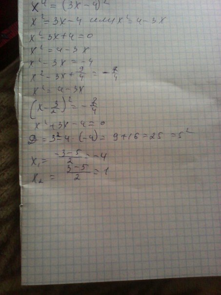 X^4=(3x-4)^2 - применим формулу сокращенного умножения (т.е. разность квадратов)