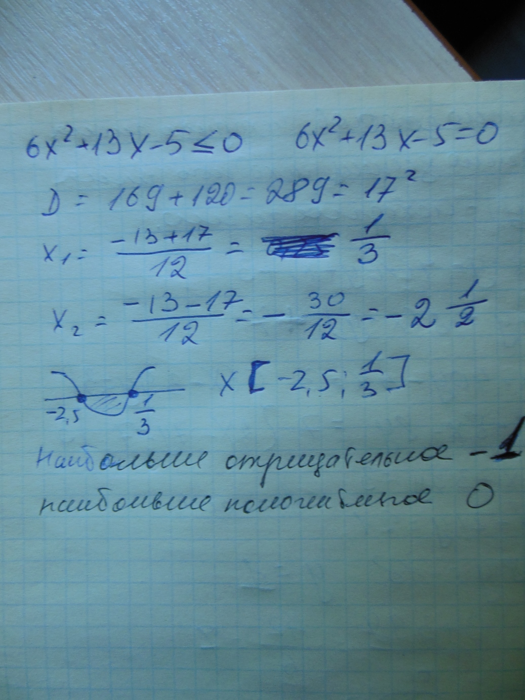 1. Решите неравенство 6x^2+13x-5<=0 + найдите наибольшее отрицательное и наибольшее положительное целые решения.