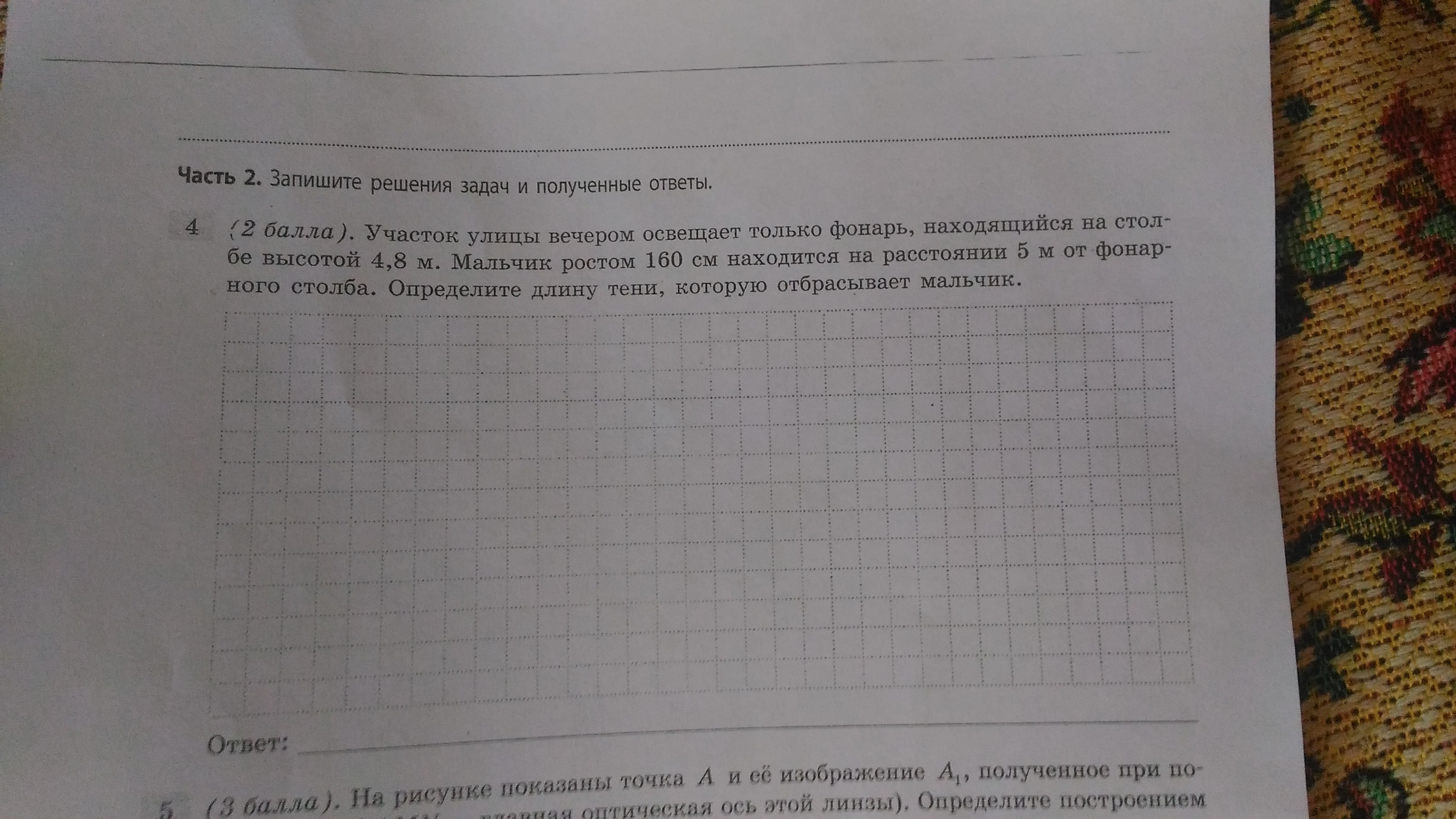 Надо построить прямоугольный треугольник высотой 4,80 м, на расстоянии 5 м отложить высоту мальчика 1,6 м. От точки (фонарь) на высоте 4,8 м провести луч через мальчика. полученные прямоугольные треугольники подобны: