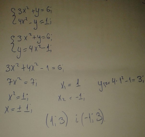 помогите решите систему {3x^2+y=6 {4x^2-y=1