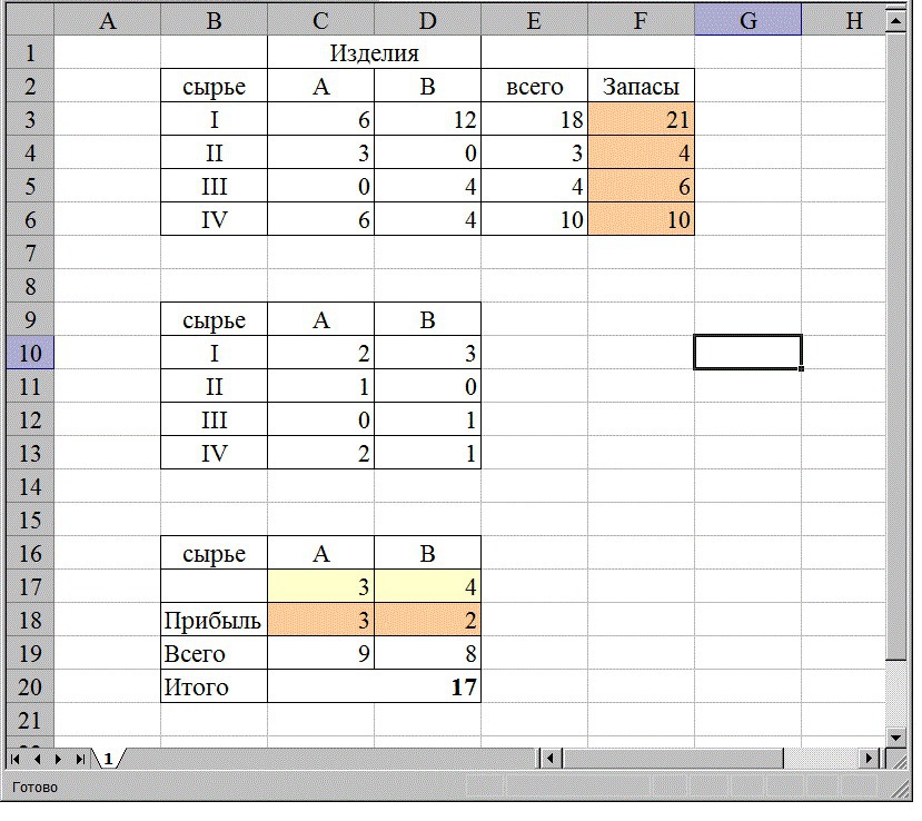 Для изделия В требуется: 3 единицы сырья I, 1 единица сырья III, 1 единица сырья IV и не используется сырьё II. Выпуск одного изделия А приносит 3 ден. ед. прибыли, одного изделия В – 2 ден. ед. прибыли.