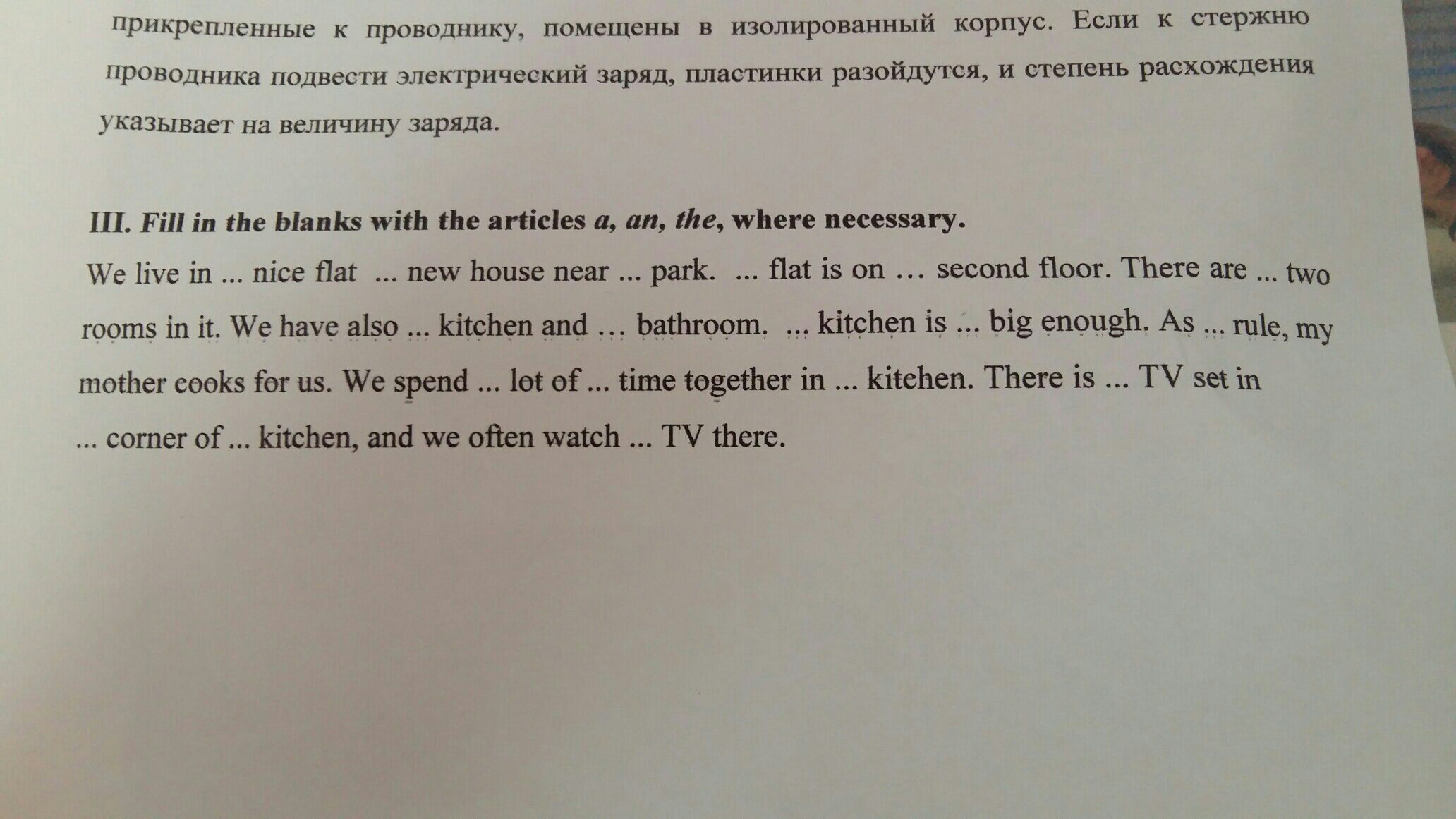 We live in a nice flat in a new house near the park. The flat is on the second floor.There are two rooms in it. We have also a kitchen and a bathroom, the kitchen is big enough.As a rule, my mother cooks for us.We spend a lot of time together in the kitchen .There is a TV set in the corner of the kitchen , and we often watch TV there.