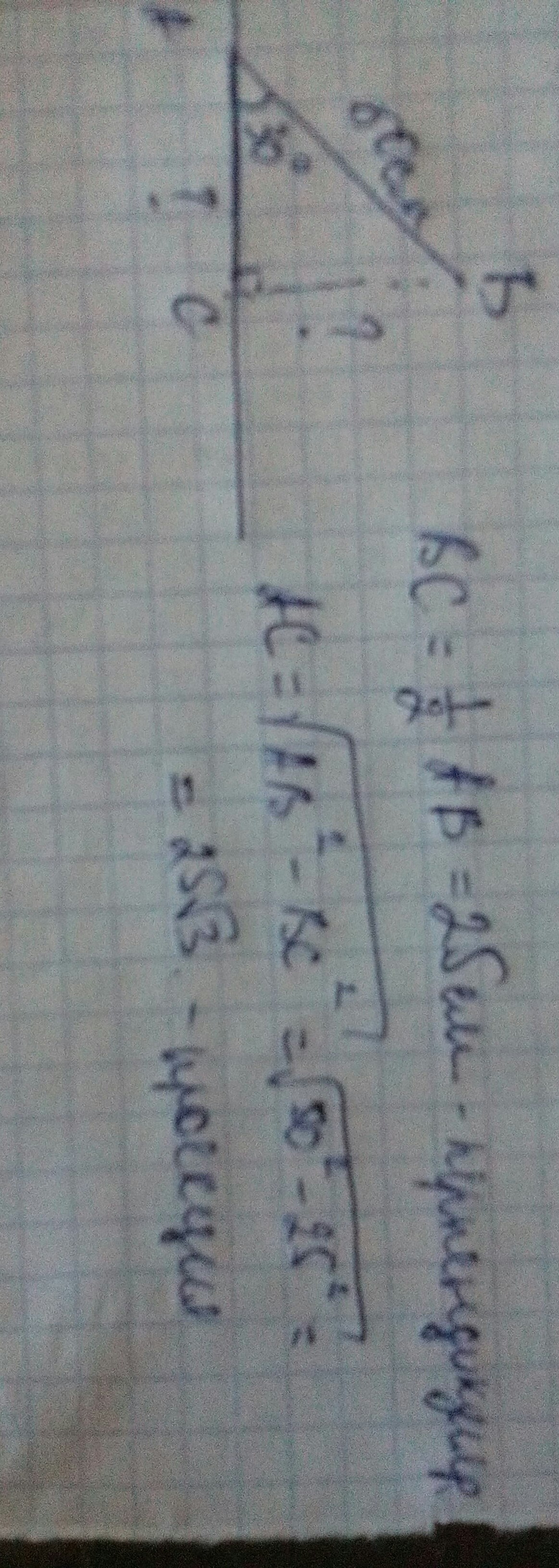 проекция лежит против угла 30 значит она равна половине гипотенузы 0,5*50=25, а у вас ни тот угол обозначен