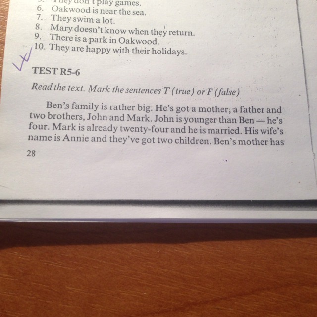 У Бена достаточно большая семья. У него есть мама, папа и два брата, Джон и Марк. Джон младше, чем Бен — ему четыре. Марку уже двадцать четыре и он женат. Его жену зовут Ани и у них есть два ребёнка. Мама Бена имеет......... (разворот страницы:))