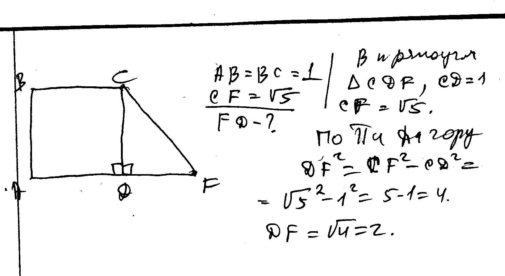 Имеем квадрат ABCD со стороной 1 и прямоугольный треугольник CDF гипотенуза CF которого равняется корень из пяти.Фигуры лежат в одной плоскости.Найдите длину катета FD треугольника CDF
