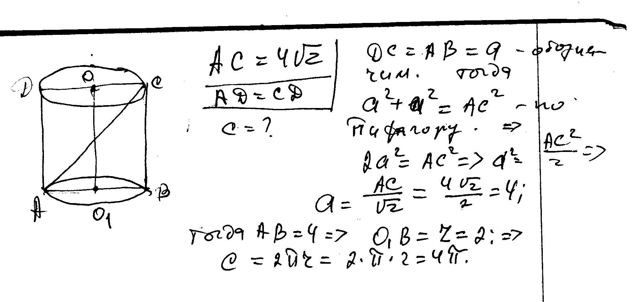 Осьовим перерiзом цилiндра е квадрат дiагональ якого дорiвнюе 4√2 см.