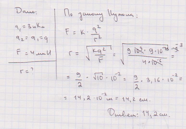 Найти расстояние, на котором взаимодействуют два заряда 3 нКл и 3 нКл, если сила взаимодействия между зарядами равна 4 мкН;
