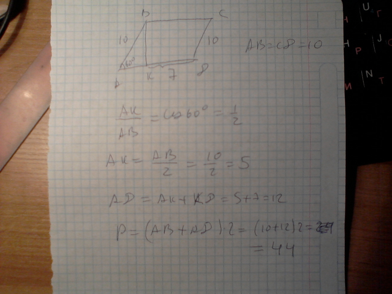ABCD-параллелограмм, BK-высота параллелограмма, СD=10 cм, КD=7 cм, угол А=60 градусов Найдите периметр параллелограмма