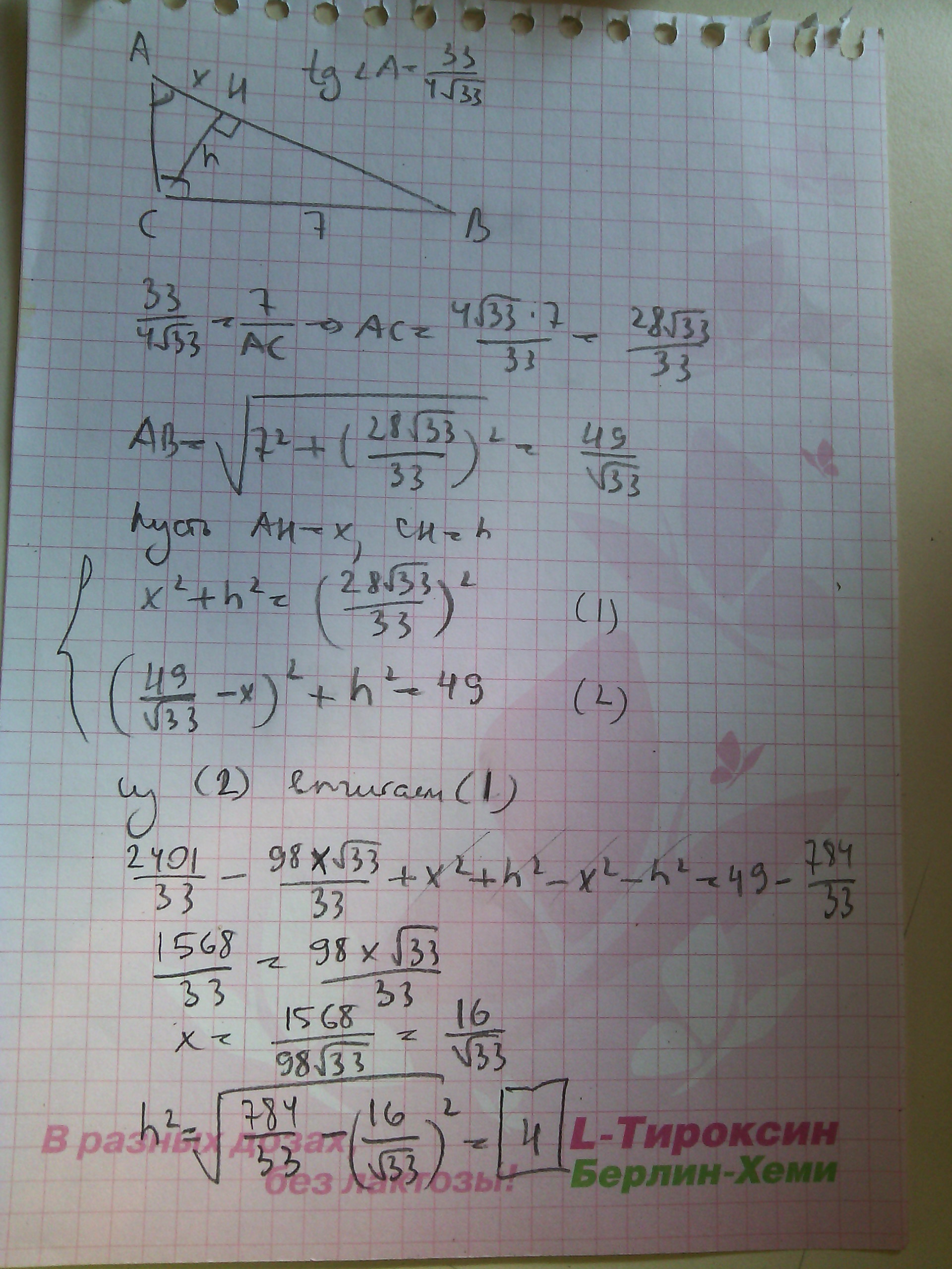 В треугольнике ABC угол C равен 90 градусов, BC = 7, tg A = 33/ 4 корня из 33. Найдите высоту CH.