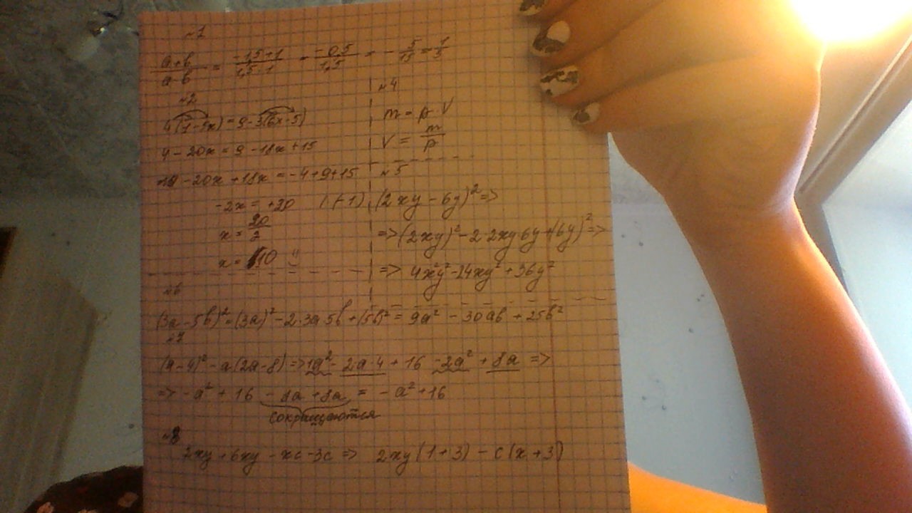 Найдите значение выражения a+b/a*b при a=-1.5 b=1 варианты Ответов: А)1/3 Б)-1/3 В)-3 Г)3. 2) Решите уравнение 4(1-5x)=9-3(6x-5) 3)Упростите выражение: x в шестой степени * x в четвёртой /x в квадрате 4)m=p*V выразите V 5)Разложите на множители 2xy-6y в квадрате 6) (3a-5b) в квадрате 7) упростите выражение (a-4) в квадрате -a(2a-8) 8)разложите на множители 2xy+6xy-xc-3c