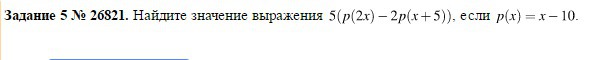 p(x)=x-10; ; Rightarrow \\p(2x)=2x-10; ,; ; p(x+5)=x+5-10=x-5\\5cdot (p(2x)-2cdot p(x+5))=5cdot (2x-10-2(x-5))=\\=5cdot (2x-10-2x+10)=5cdot 0=0
