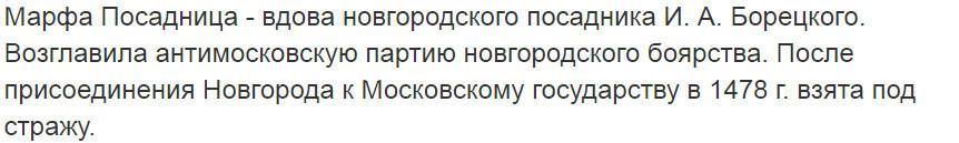 О начальном периоде жизни Марфы известно очень мало. Известно, что она происходила из боярского рода Лошинских[3] и что она дважды выходила замуж. Первым мужем был боярин Филипп, в браке родилось двое сыновей, Антон и Феликс, которые утонули наКарельском берегу Белого моря[2]. Вторым её мужем был новгородский посадникИсаак Борецкий[4]. Марфа Борецкая никогда не была и не могла быть формально «посадницей». Такое прозвище было просто злой насмешкой москвичей над государственным строем самобытной республики — Великого Новгорода. Будучи вдовой богатого землевладельца и сама владевшая обширными землями по берегам Двины и Студеного моря, она впервые появляется на политической сцене Новгорода в 1470 году во время выборов новогоархиепископа Новгородского. Поддерживаемый ею Пимен не получает сан, а избранного Феофила посвящают в Москве, а не в Киеве, как того хотела литовская партия.