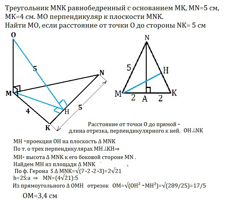 Треугольник MNK равнобедренный с основанием MK, MN=5 см, MK=4 см. MO перпендикуляр к плоскости MNK. Найти MO если расстояние от точки O до стороны NK= 5 см