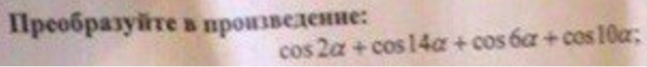 cos2 alpha + cos14 alpha + cos6 alpha + cos10 alpha =2*cos frac{14  alpha +2 alpha  }{2} cosfrac{14 alpha -2 alpha }{2} +2*cosfrac{10 alpha +6 alpha }{2} cosfrac{10alpha -6alpha }{2} =2cos8 alpha *cos6 alpha +2cos8 alpha *cos2 alpha =2cos8 alpha (cos6 alpha +cos2 alpha )=2cos8 alpha *2cos frac{6 alpha +2 alpha }{2} cos frac{6 alpha -2 alpha }{2} =4cos8 alpha *cos4 alpha *cos2 alpha