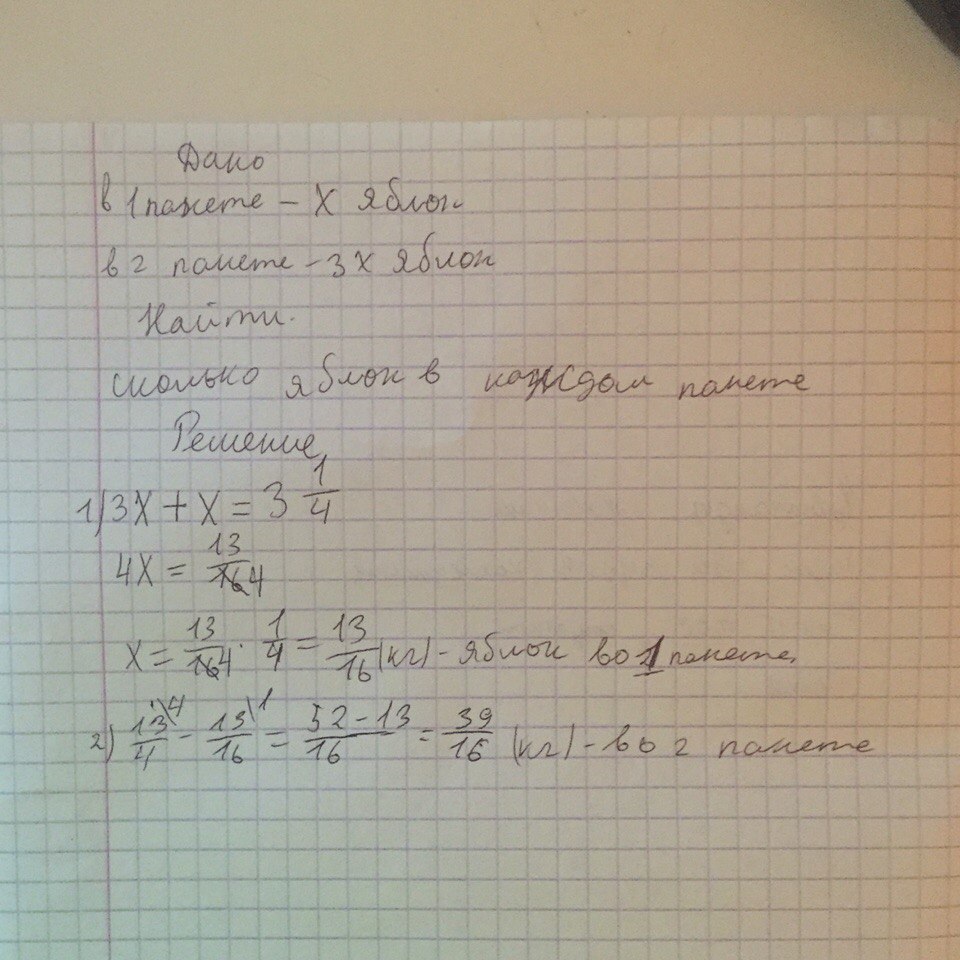 в двух пакетах 3 1/4кг яблок.В одном пакете яблок в 3 раза больше ,чем вдругом.Сколько кг яблок в каждом пакете?