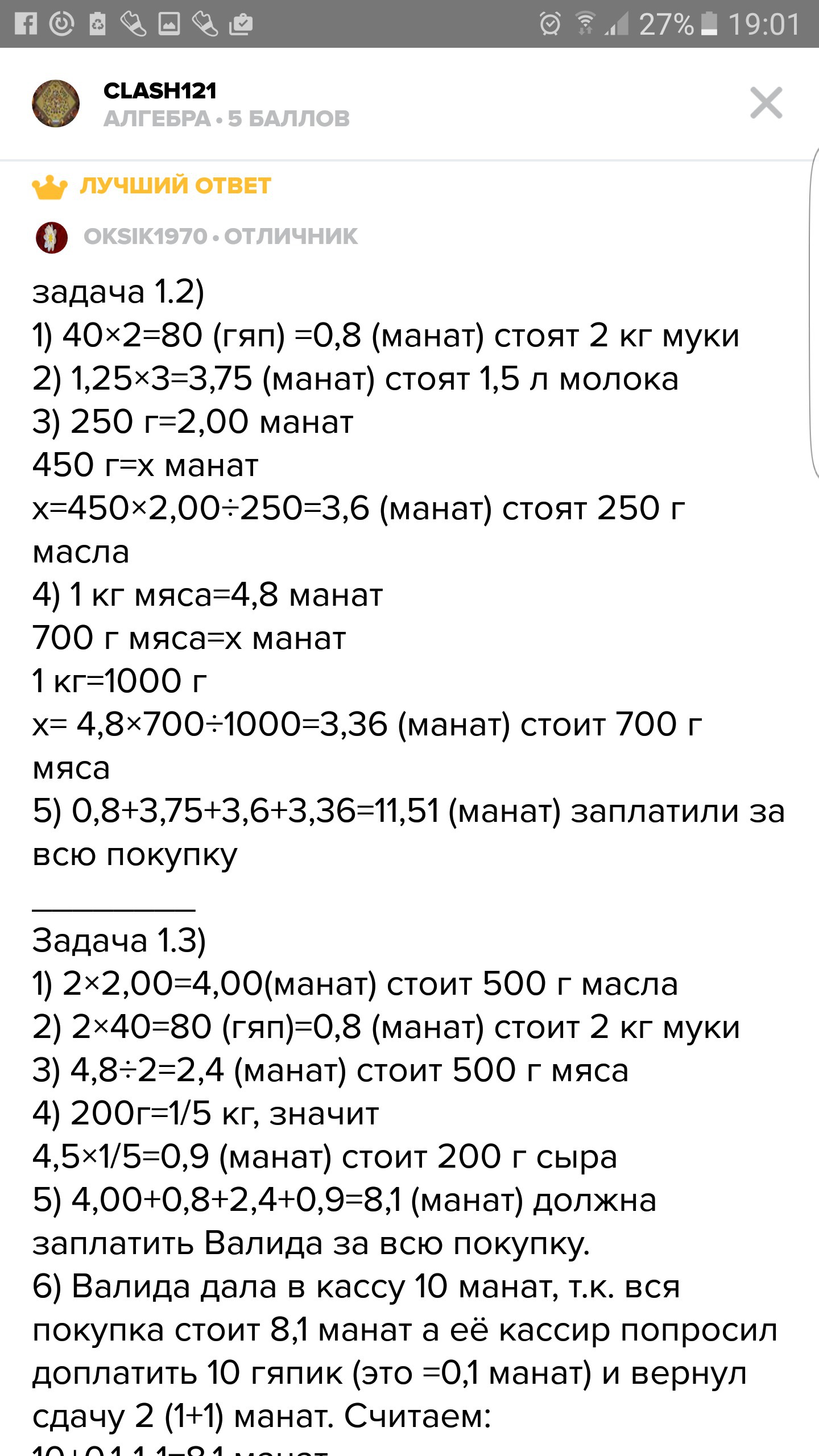 1) Если мука 1 кг стоит 40 гяп = 0,4 манат, значит 2 кг муки стоит: