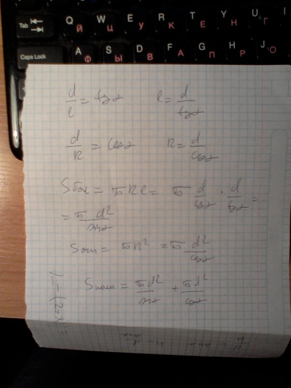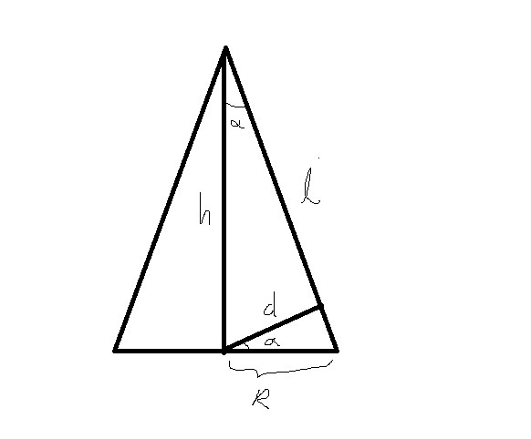 расстояние от центра основания конуса до его образующей равно d угол между образующей и высотой равен а. Найти полную поверхность конуса