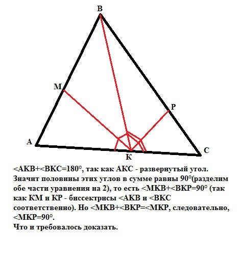 Значит половины этих углов в сумме равны 90°(разделим обе части уравнения на 2), то есть <MKB+<BKP=90° (так как КМ и КР - биссектрисы <AKB и <BKC соответственно). Но <MKB+<BKP=<MKP, следовательно, <MKP=90°.