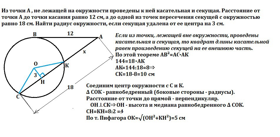 из точки А , не лежащей на окружности проведены к ней касательная и секущая. Расстояние от точки А до точки касания равно 12 см, а до одной из точек пересечения секущей с окружностью равно 18 см. Найти радиус окружности, если секущая удалена от ее центра на 3 см.
