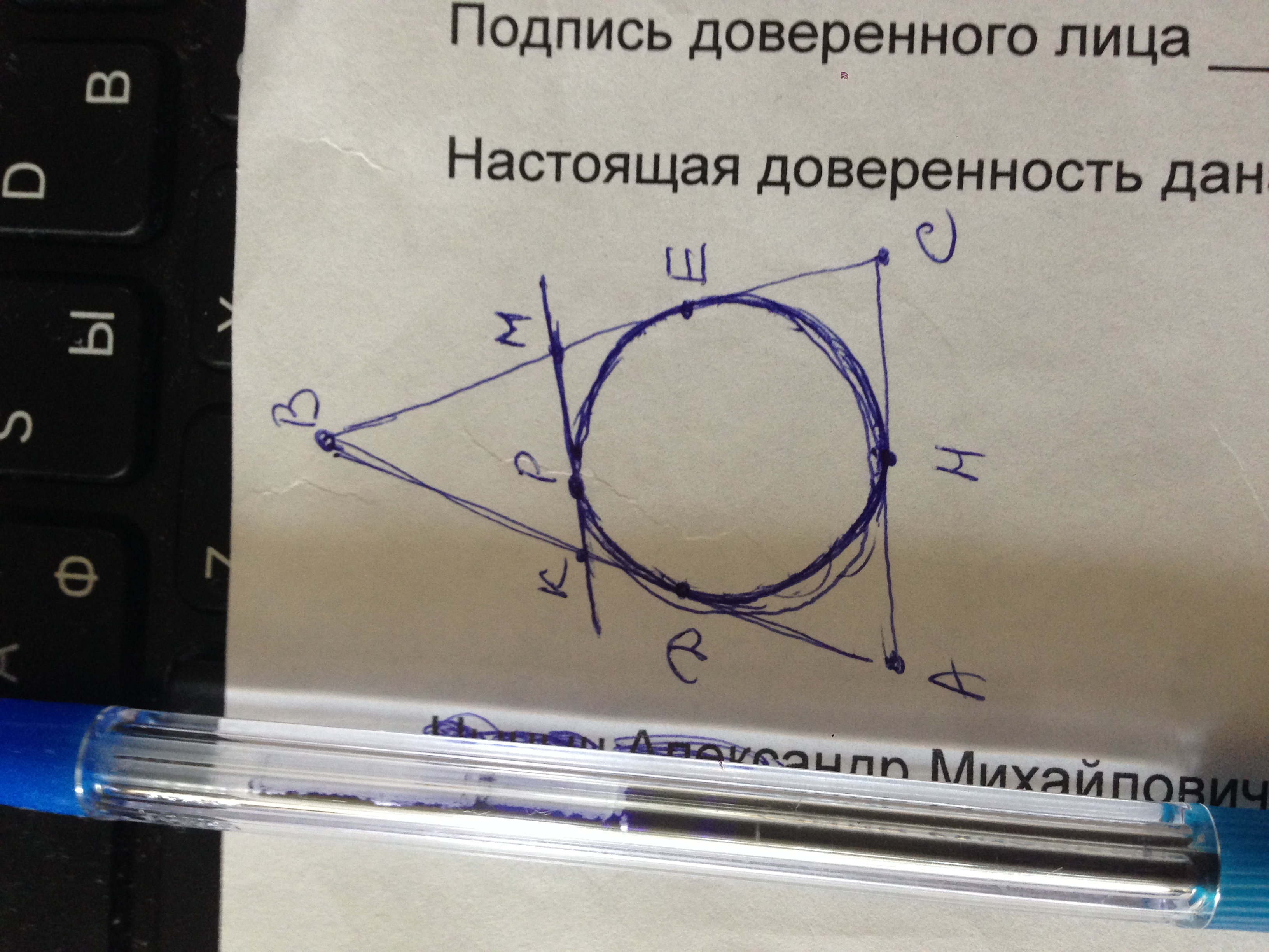 В тр-ке АВС АВ=ВС=10 см, АС=4 см, Касательная пересекает стороны АВ и ВС в точках К и М, касаясь окружности в точке Р.