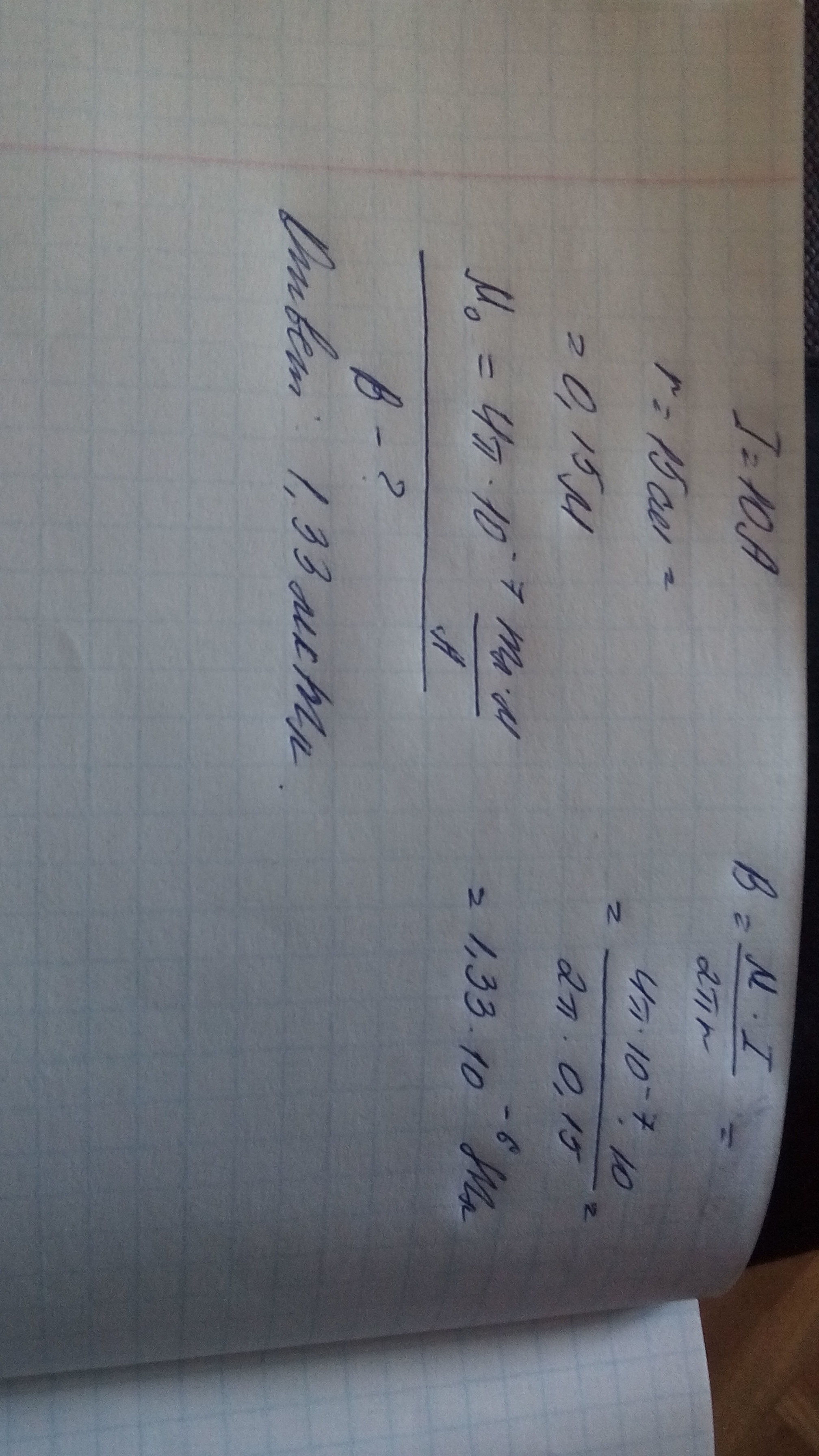 определите B индукцию магнитного поля , создаваемого бесконечно длинным проводником с током I = 10 А на расстоянии r=15см от проводника