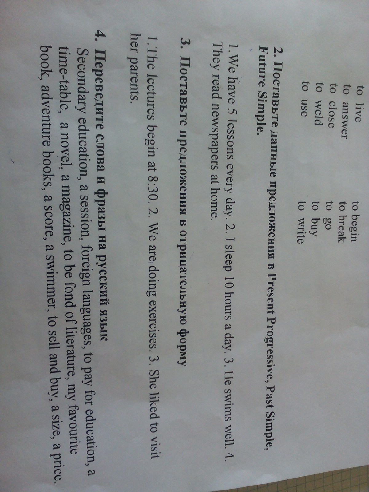 Среднее образование, сессия, иностранные языки, платить за обучение, расписание, роман, увлекаться литературой, моя любимая книга, приключенческие книги, оценка, пловец, продавать и покупать, размер, цена.