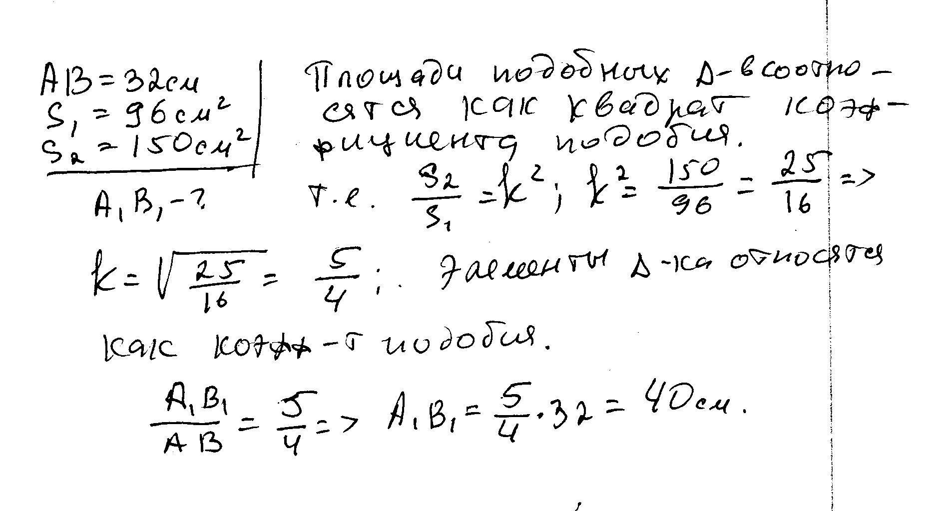 площади двух подобных треугольника соответственно равны 96 см.кв и 150 см .кв . Сторона меньшего треугольника 32 см . Найти соответствующую ей сторону большего треугольника