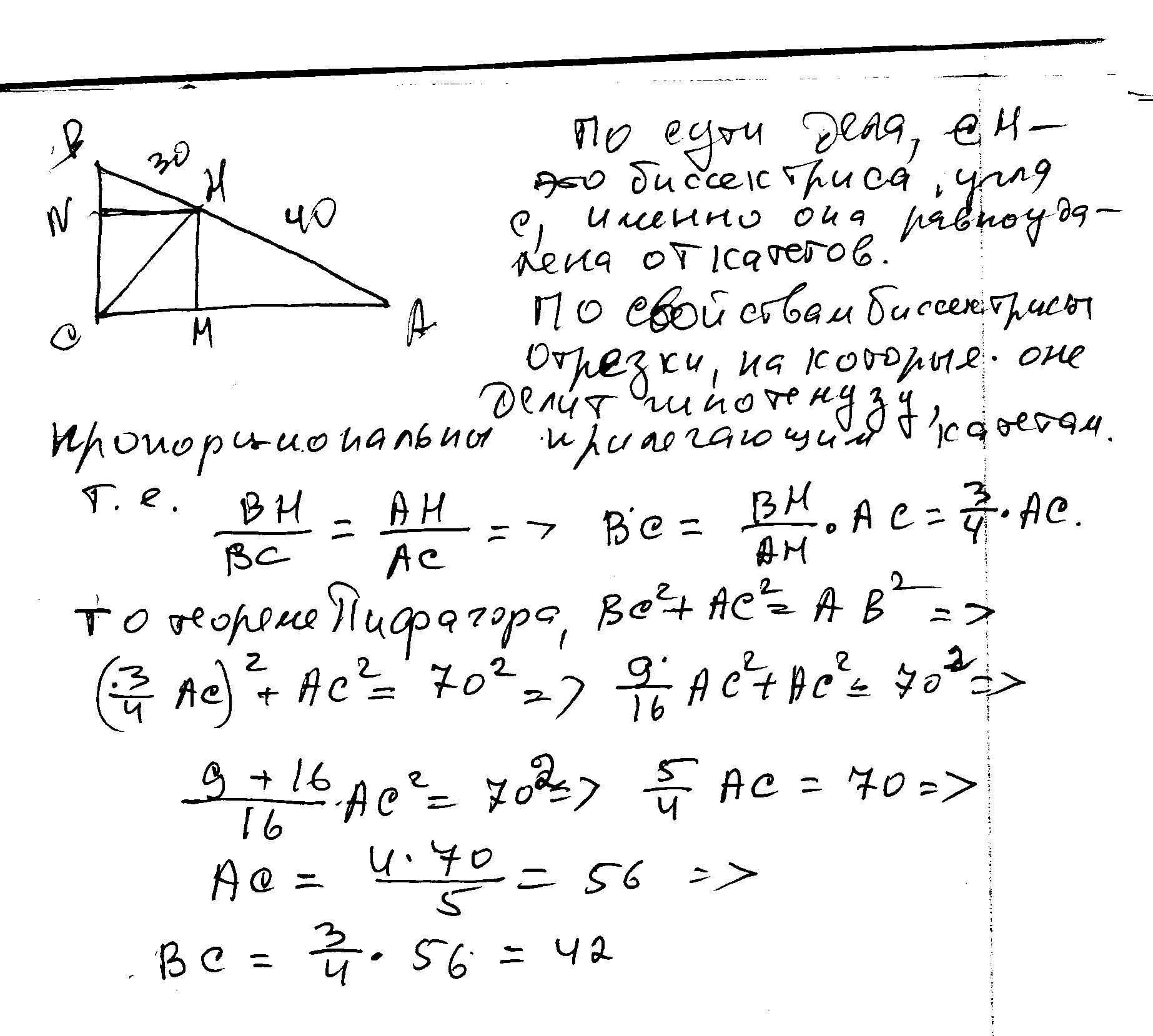 рівновіддалена від катетів точка гіпотенузи прям.трикутника ділить її на відрізки 30 см і 40 см.Знайдіть катети
