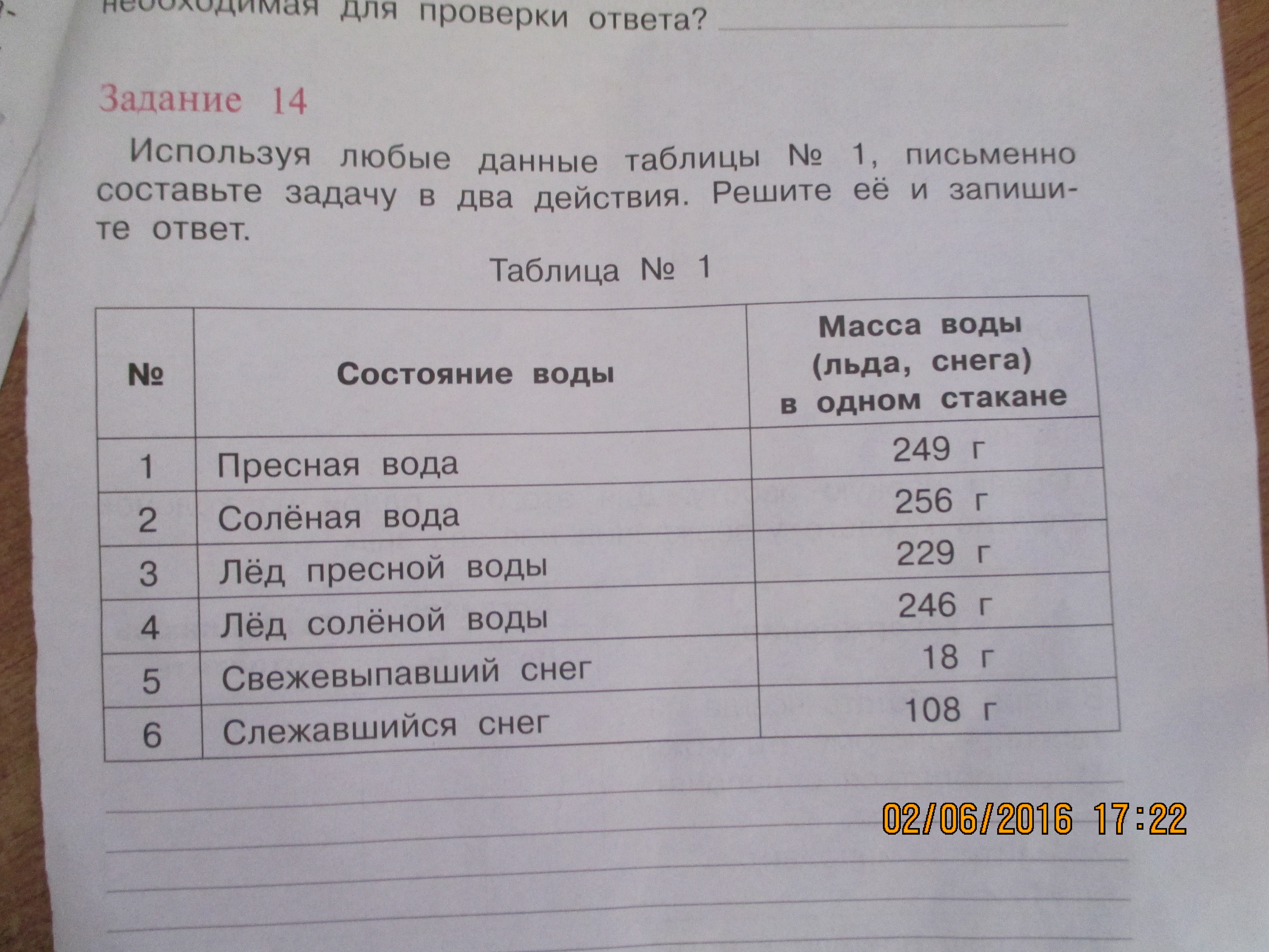 Используя любые данные таблицы №1, письменно составьте задачу в два действия. Реши её и запиши ответ.