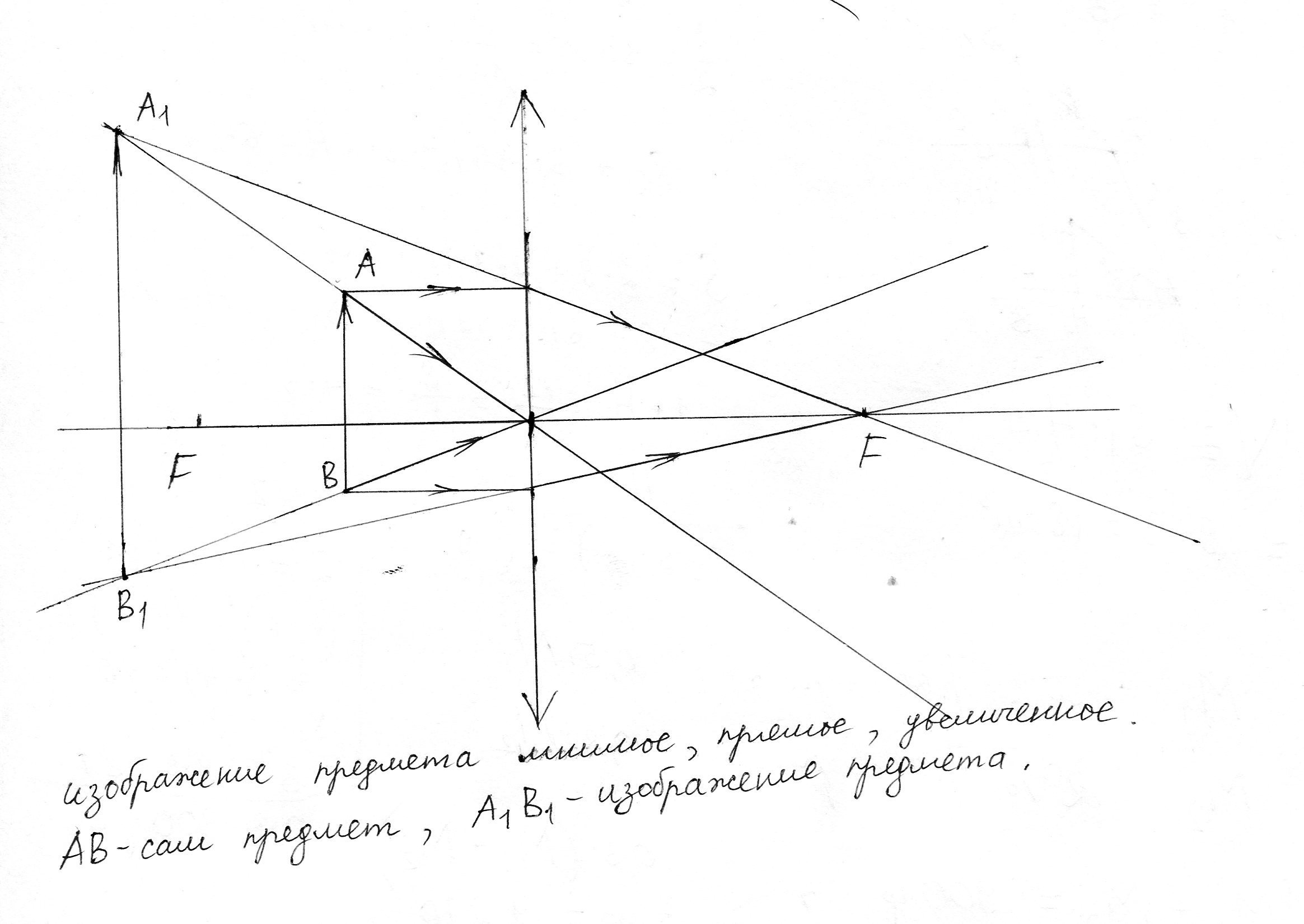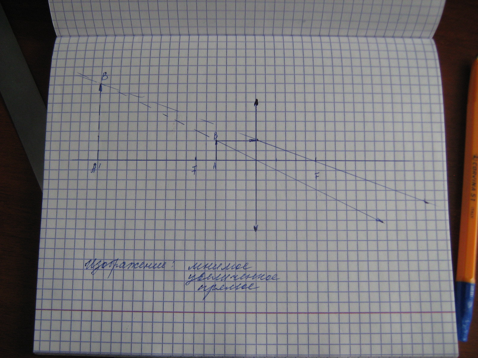 Построить и охарактеризовать изображение предмета с помощью собирающей линзы, если предмет расположен между фокусом и оптическим центром.