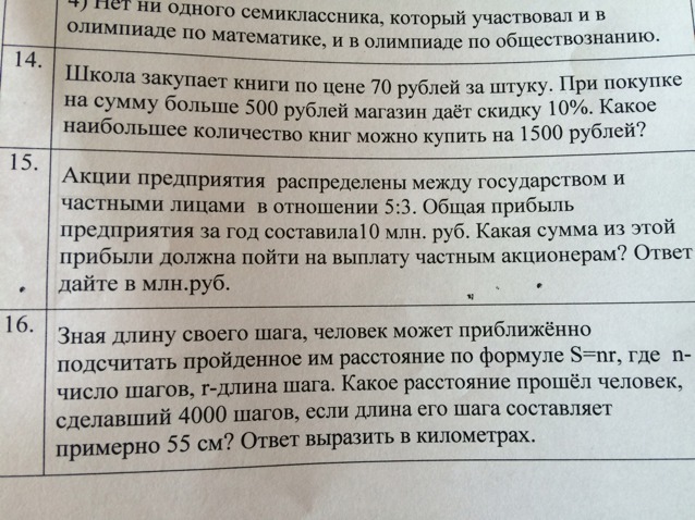 14. Находим цену книги со скидкой в 10%: (70*90%)/100%=63р. Находим кол-во. книг 1500/63=23.8, а значит 23 книги.