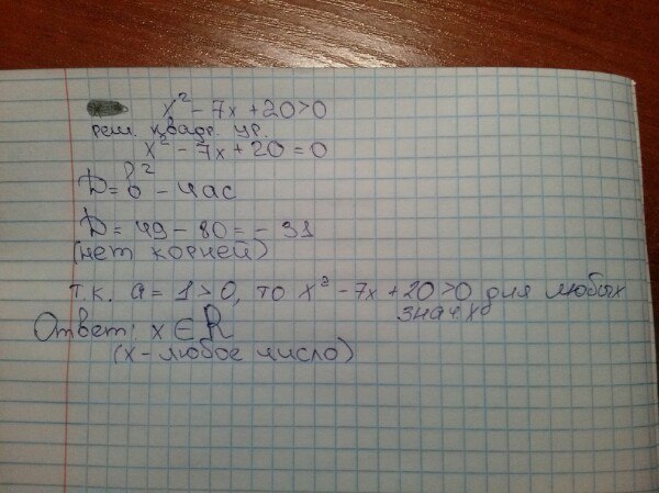 Значит выражение x² - 7x + 20 будет больше нулю при любых значениях x.