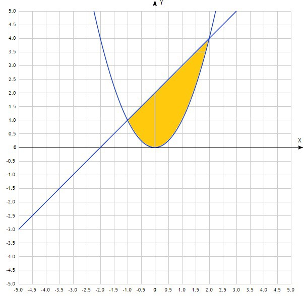 1) Искомая фигура ограничена прямой сверху и параболой снизу (как видно из рисунка) на отрезке [-1;2]
