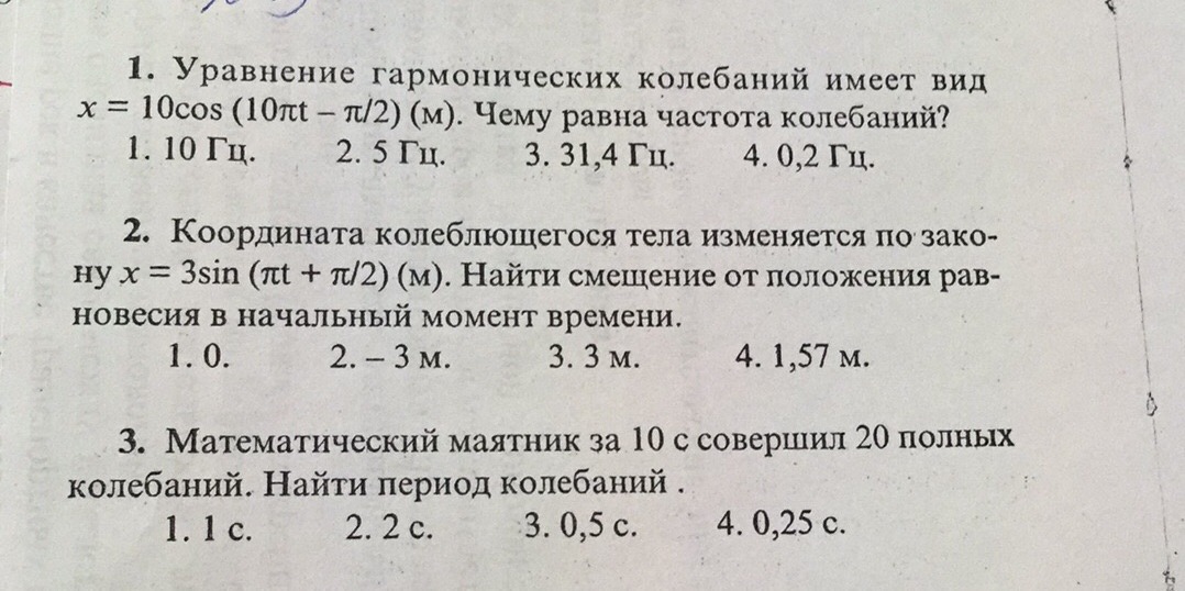 ’ / " / Ё » 1. Уравнение гармонических колебаний имеет вид ‘ х = 10005 — Чему равна частота колебаний 1. 10 Гц 2. 5 Гц 3. 31,4 ГЦ 4. 0,2 Гц 9 2. Координата колеблющегося тела изменяется ну х = 35111 + Найти смещение от положения ` иноверия в начальный момент времени 1.0. Ф 3. Математический маятник за 10 с совершил 20 полных колебаний Найти период колебаний . 1. 1 2. 2 3. 0,5 4. 0,25 0. Ж