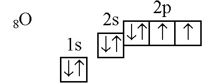 он имеет 8 электронов, их электронная конфигурация такая: 1s2 2s2 2p4, что значит, что на s и p орбиталях у него есть две неподеленные пары (приложу картинку) и два неспаренных электрона. Неспаренные электроны образуют связи с другими атомами, а неподеленные пары так и остаются около кислорода.