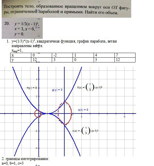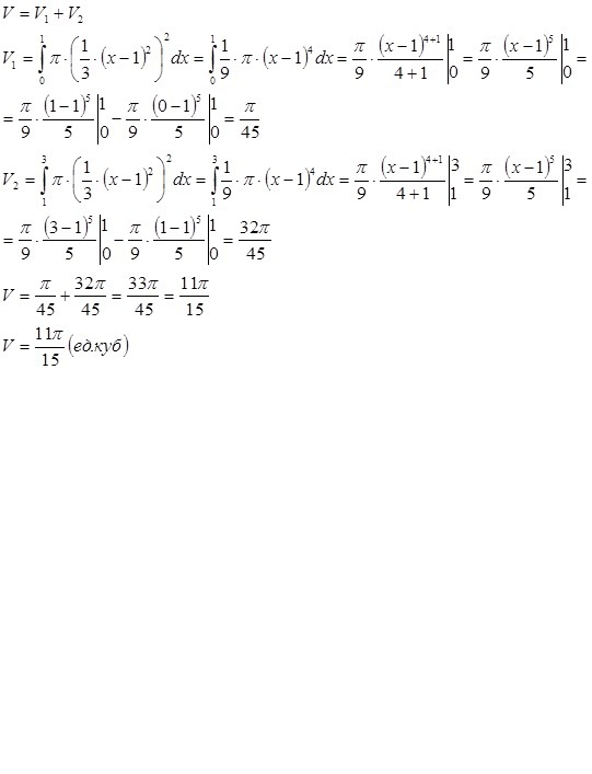 V=π∫₀³ ((x-1)²/3)²=π∫₀³ (x-1)⁴/9=(π/9)∫₀³ (x-1)⁴=(π/9)*(x-1)⁵/5 I₀³=
